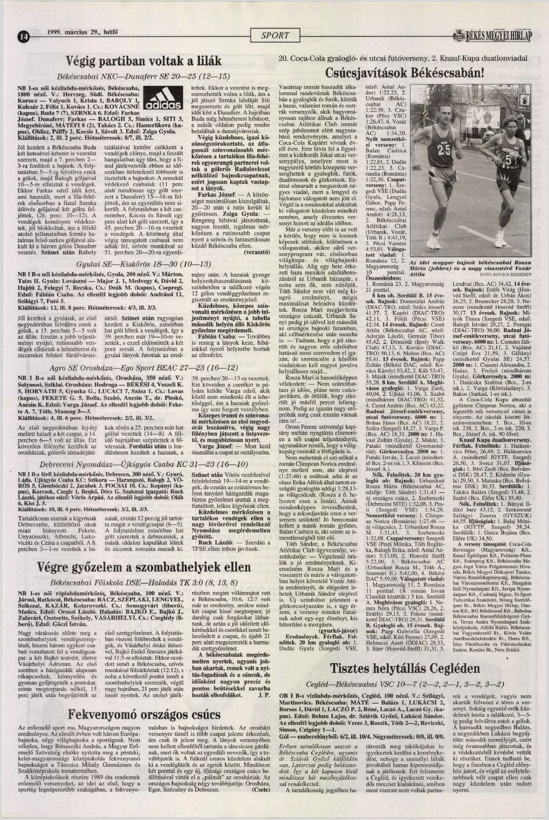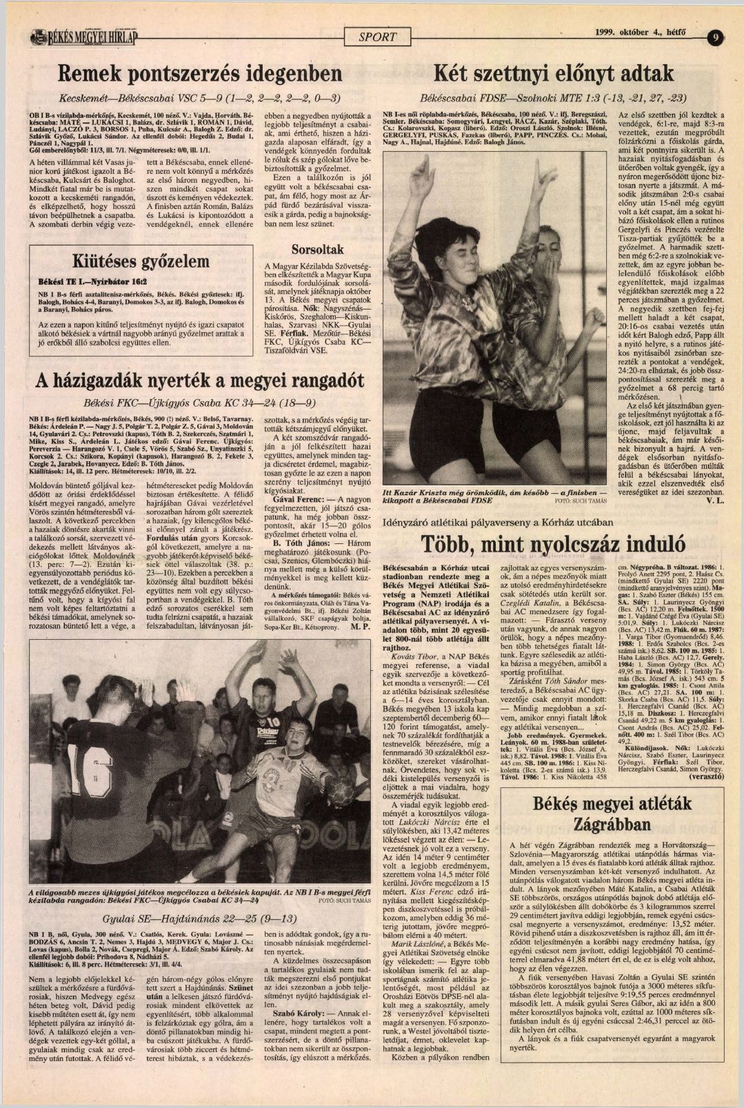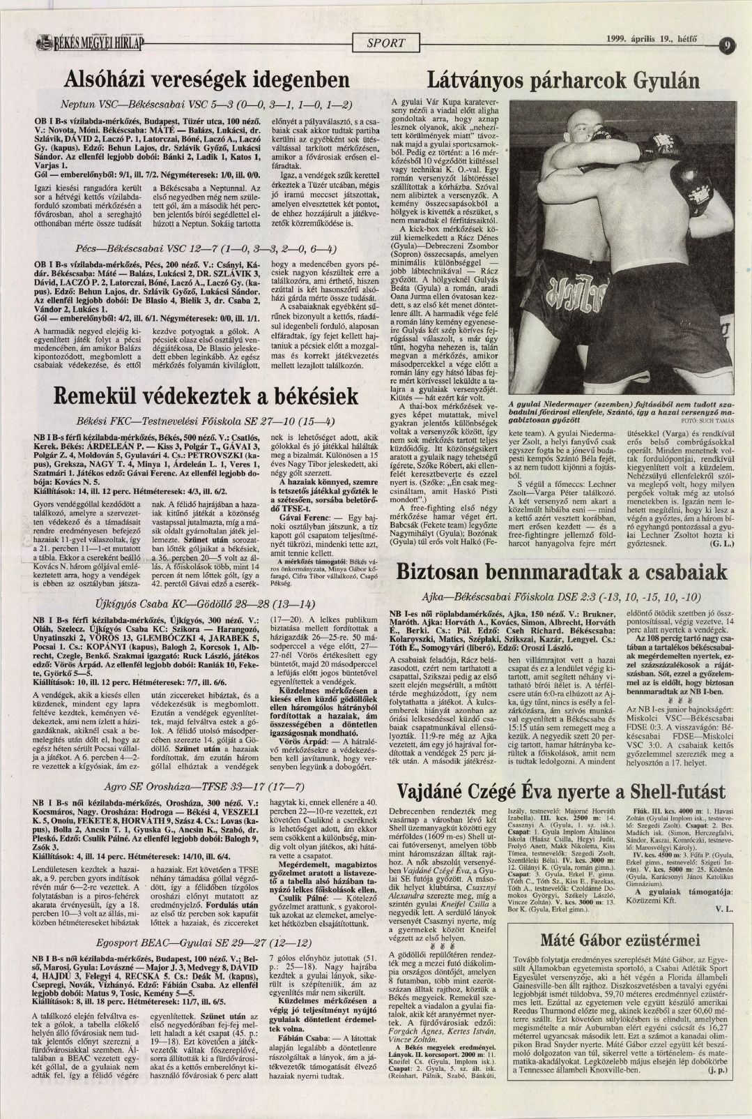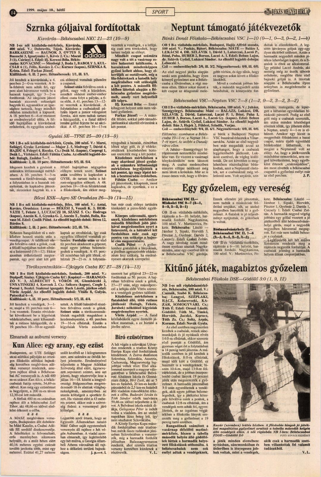 NB I B-s férfi kézilabda-mérkőzés, Békés, 900 (!) néző. V.: Belső, Tavarnay. Békés: Árdeleán P. — Nagy J. 5, Polgár T. 2, Polgár Z. 5, Gávai 3, Moldován 14, Gyulavári 2. Cs.: Petrovszki (kapus), Tóth B. 2, Szekerczés, Szatmári 1, Mike, Kiss S., Árdeleán L. Játékos-edző: Gávai Ferenc. Újkígyós: Pereverzia — Harangozó V. 1, Csele 5, Vörös 5, Szabó Sz., Unyatinszki 5, Korcsok 2. Cs.: Szikora, Kopányi (kapusok), Harangozó B. 2, Fekete 3, Czegle 2, Jarabek, Hovanyecz. Edző: B. Tóth János. Kiállítások: 14, ill. 12 perc. Hétméteresek: 10/10, ill. 2/2.