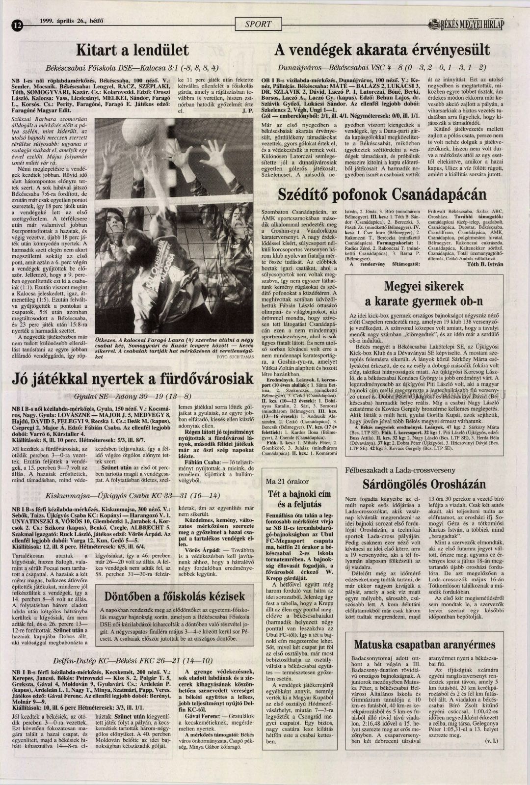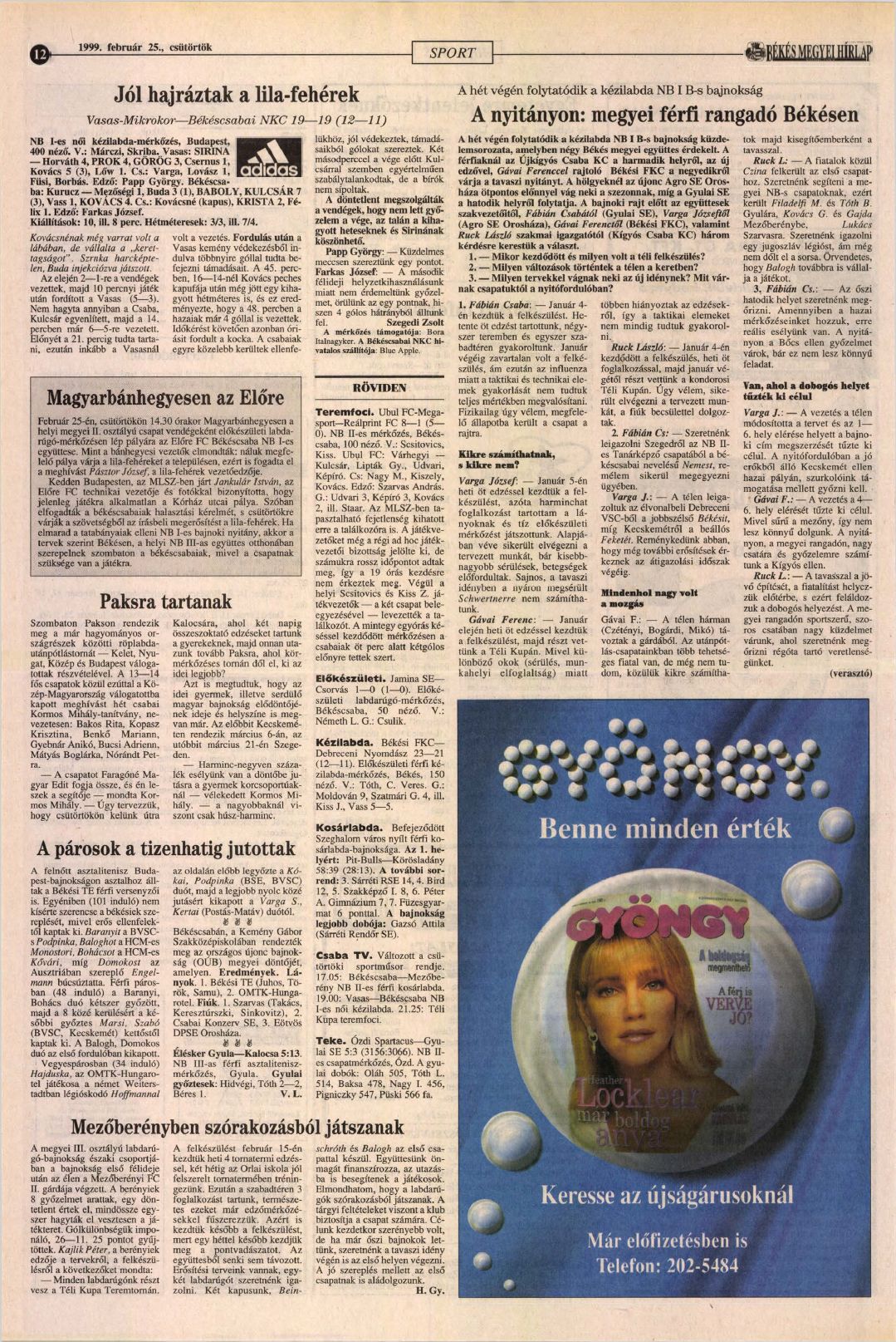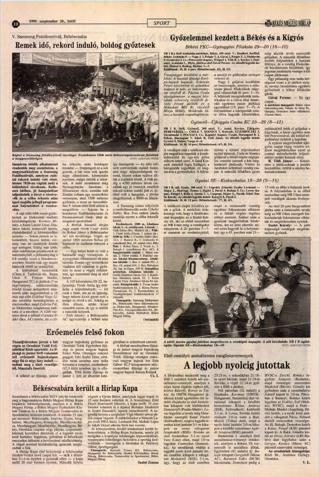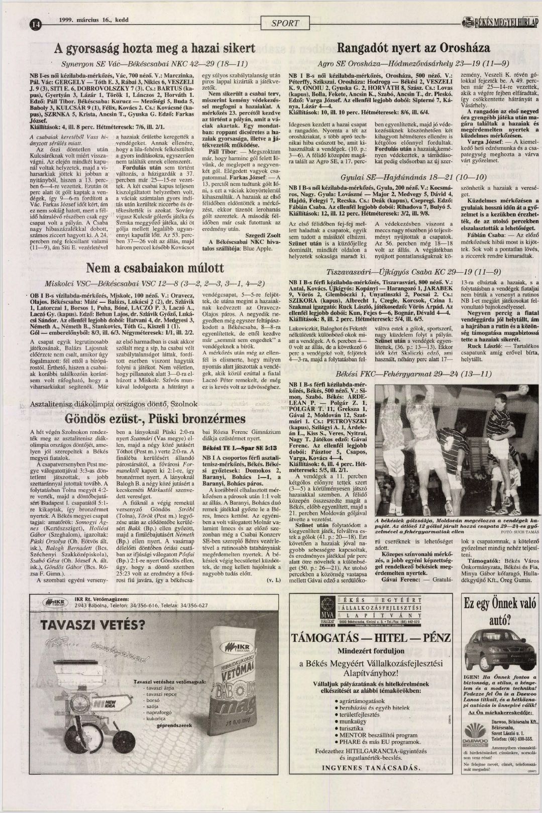 NB I B-s férfi kézilabda-mérkőzés, Békés, 900 (!) néző. V.: Belső, Tavarnay. Békés: Árdeleán P. — Nagy J. 5, Polgár T. 2, Polgár Z. 5, Gávai 3, Moldován 14, Gyulavári 2. Cs.: Petrovszki (kapus), Tóth B. 2, Szekerczés, Szatmári 1, Mike, Kiss S., Árdeleán L. Játékos-edző: Gávai Ferenc. Újkígyós: Pereverzia — Harangozó V. 1, Csele 5, Vörös 5, Szabó Sz., Unyatinszki 5, Korcsok 2. Cs.: Szikora, Kopányi (kapusok), Harangozó B. 2, Fekete 3, Czegle 2, Jarabek, Hovanyecz. Edző: B. Tóth János. Kiállítások: 14, ill. 12 perc. Hétméteresek: 10/10, ill. 2/2.