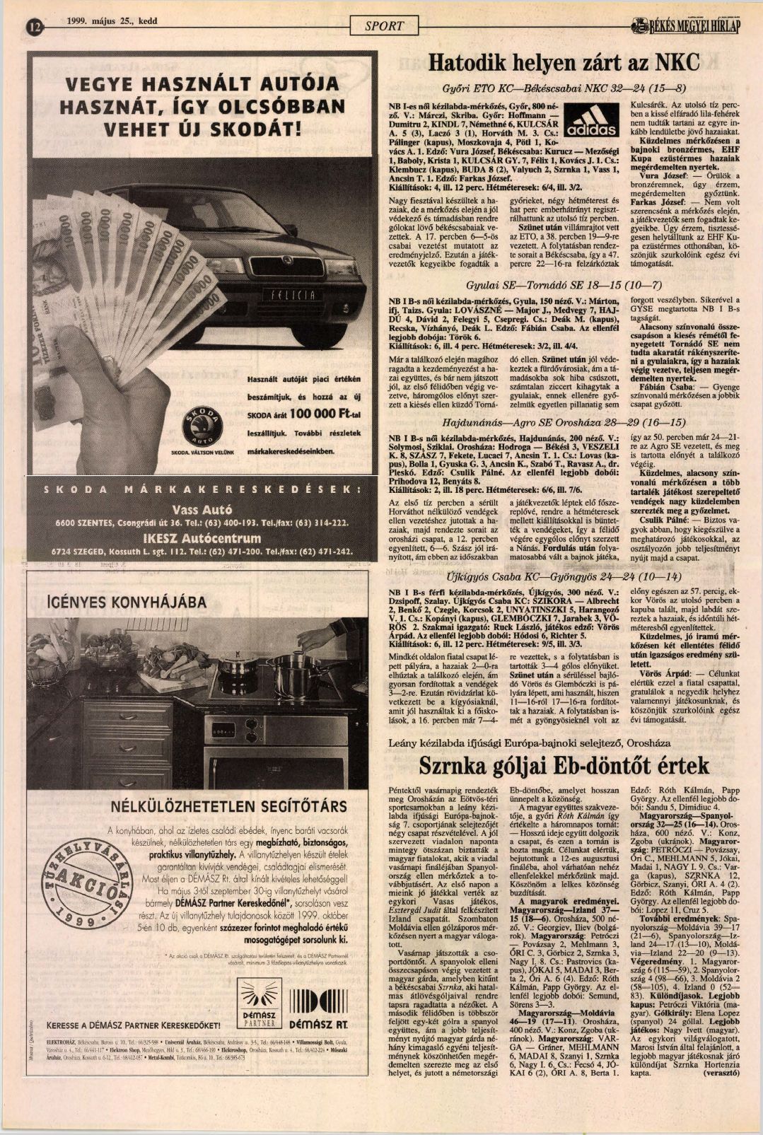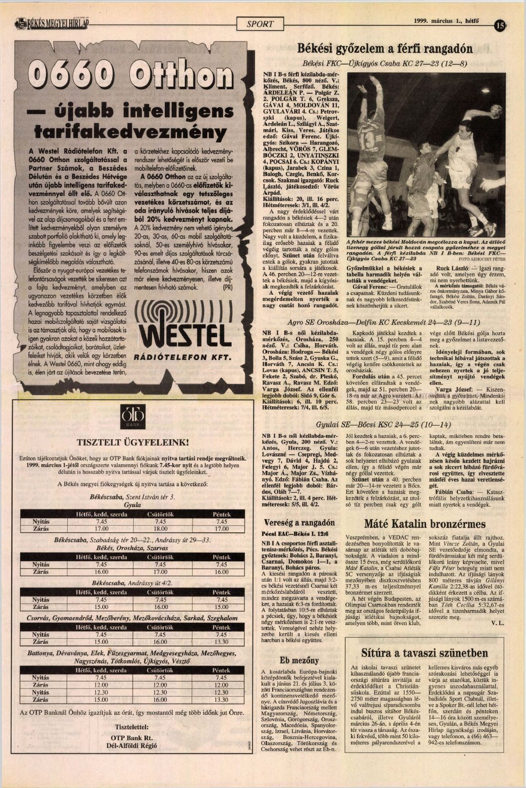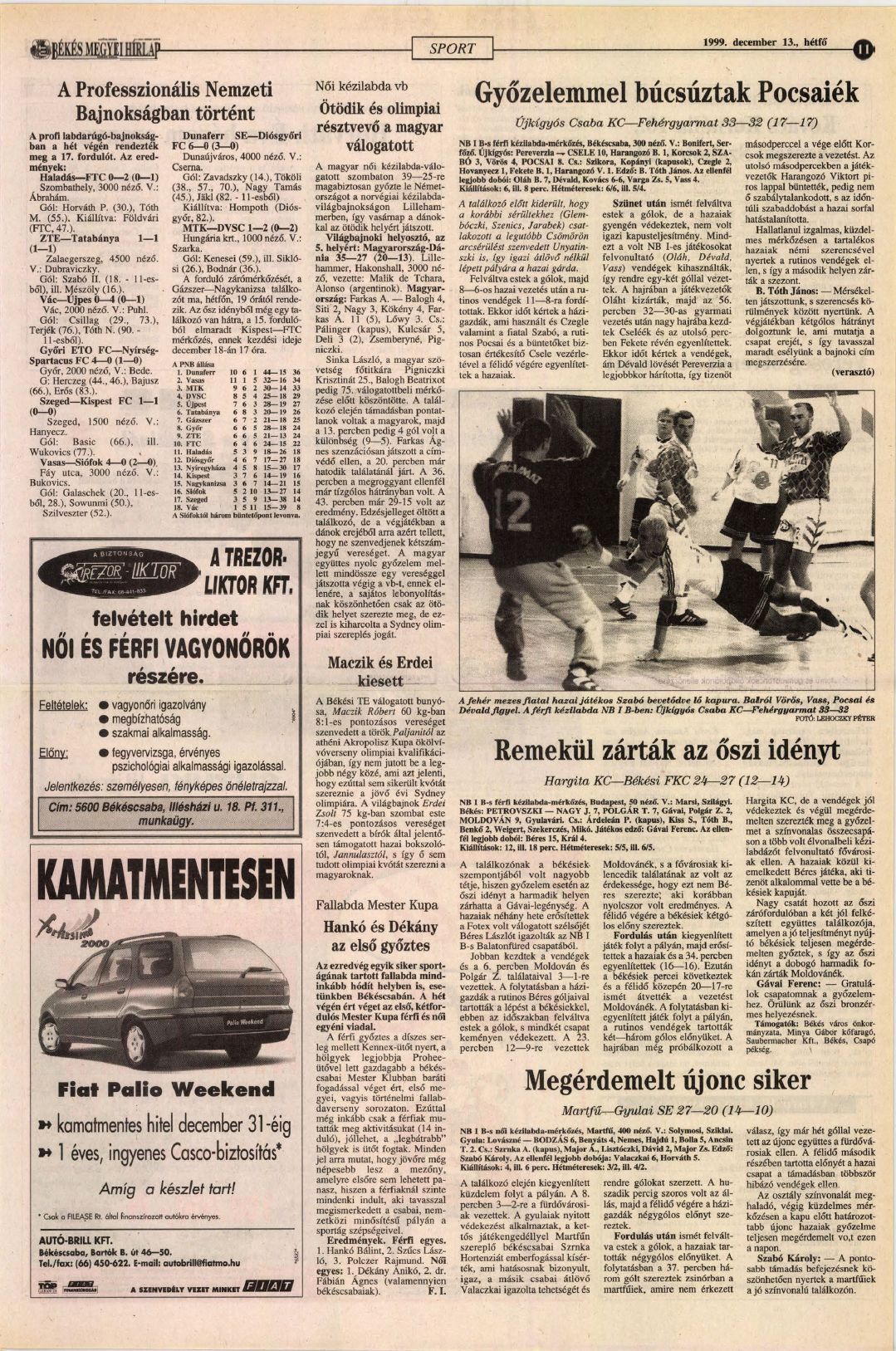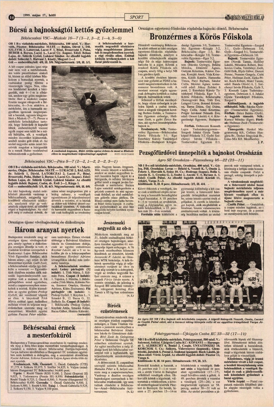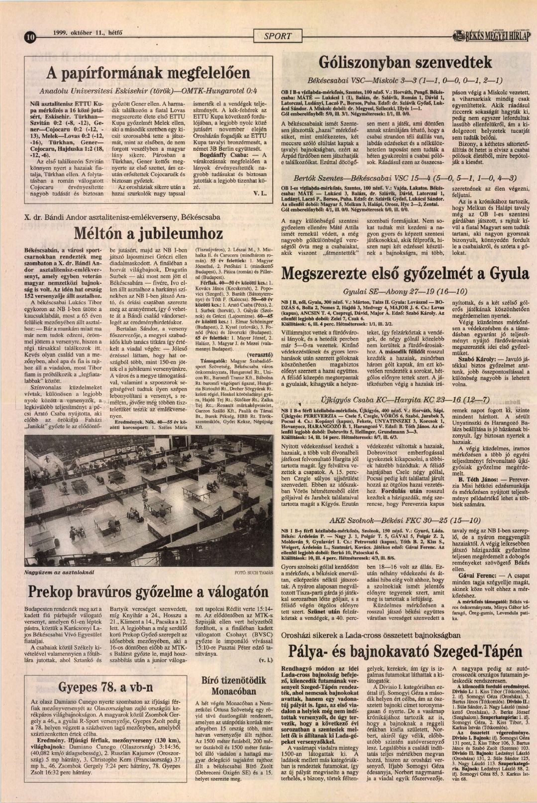 NB I B-s férfi kézilabda-mérkőzés, Békés, 900 (!) néző. V.: Belső, Tavarnay. Békés: Árdeleán P. — Nagy J. 5, Polgár T. 2, Polgár Z. 5, Gávai 3, Moldován 14, Gyulavári 2. Cs.: Petrovszki (kapus), Tóth B. 2, Szekerczés, Szatmári 1, Mike, Kiss S., Árdeleán L. Játékos-edző: Gávai Ferenc. Újkígyós: Pereverzia — Harangozó V. 1, Csele 5, Vörös 5, Szabó Sz., Unyatinszki 5, Korcsok 2. Cs.: Szikora, Kopányi (kapusok), Harangozó B. 2, Fekete 3, Czegle 2, Jarabek, Hovanyecz. Edző: B. Tóth János. Kiállítások: 14, ill. 12 perc. Hétméteresek: 10/10, ill. 2/2.