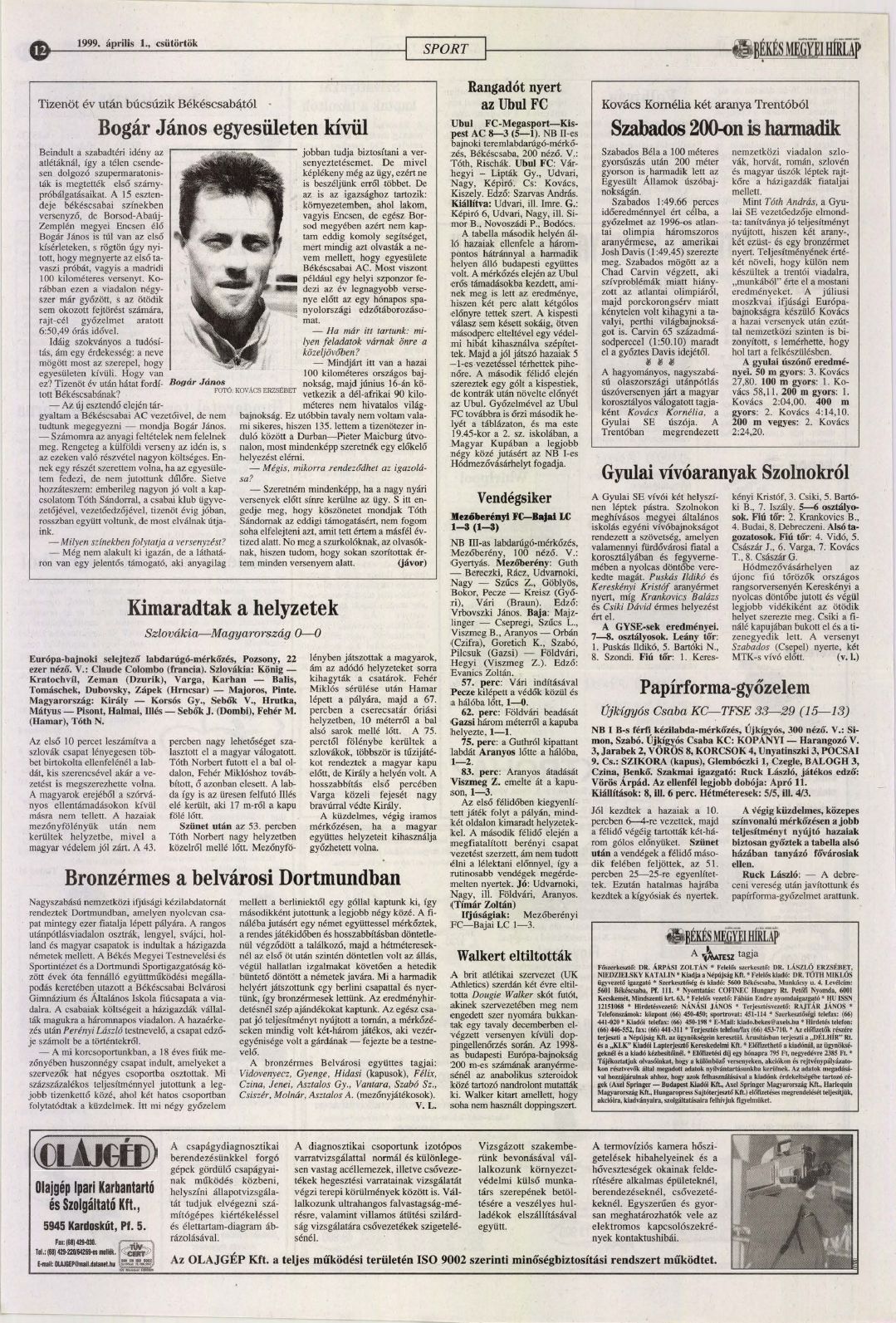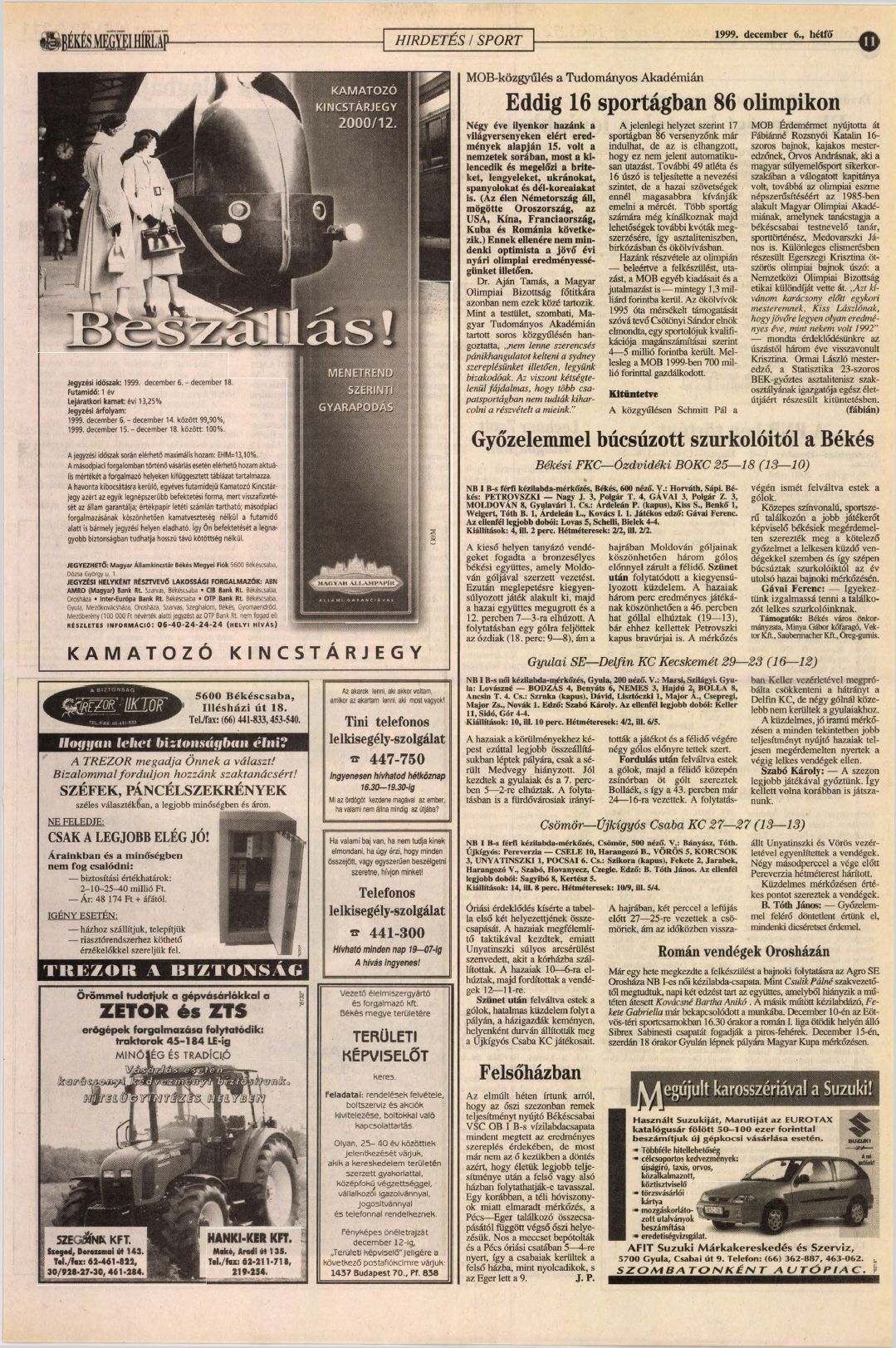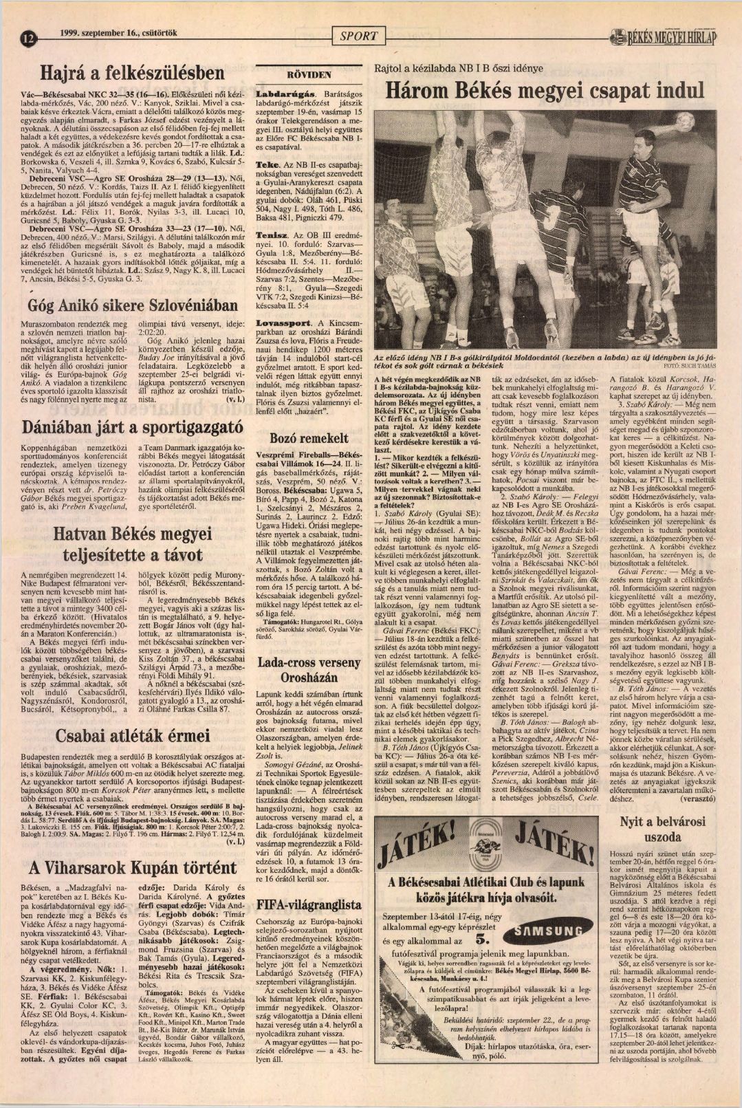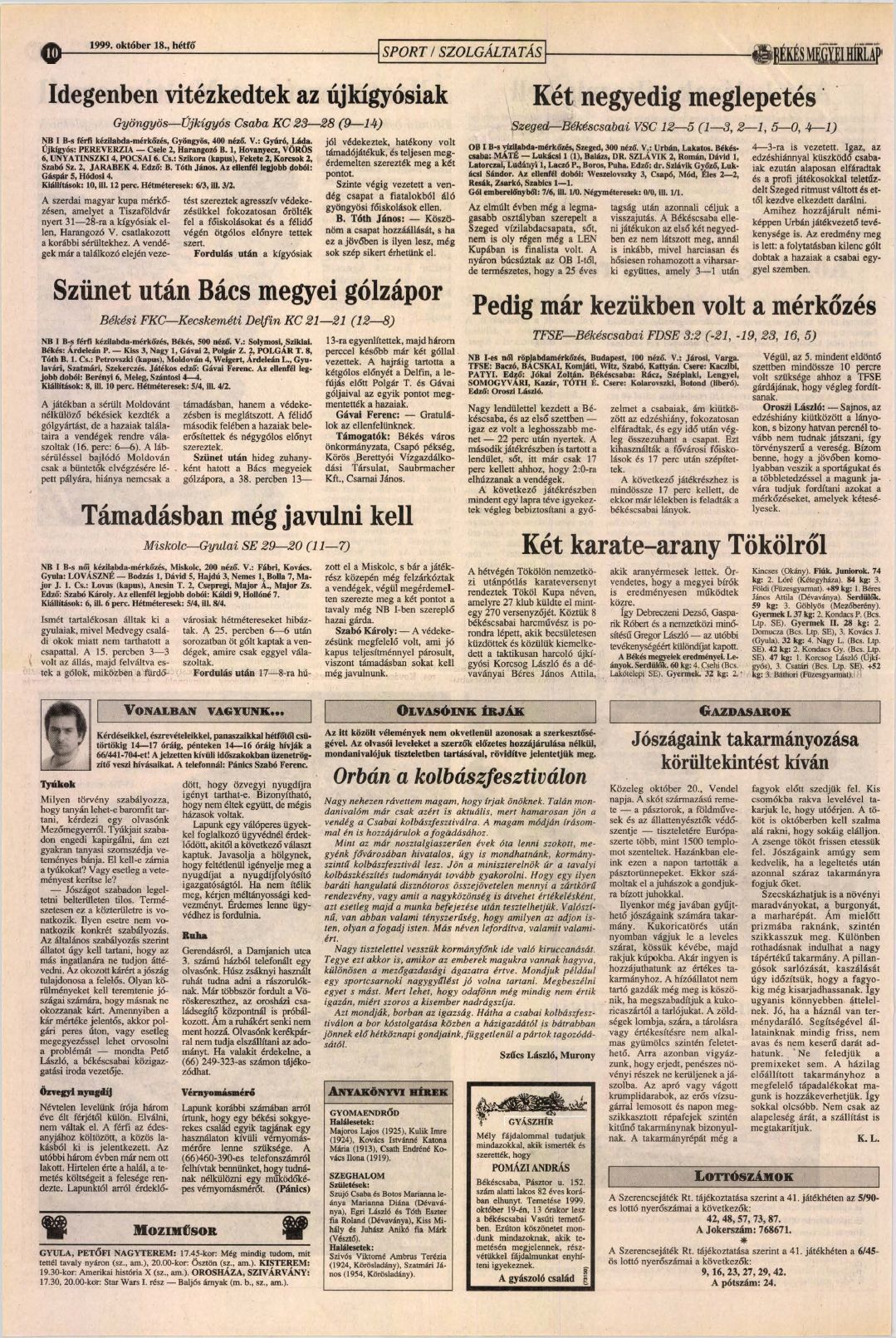 NB I B-s férfi kézilabda-mérkőzés, Békés, 900 (!) néző. V.: Belső, Tavarnay. Békés: Árdeleán P. — Nagy J. 5, Polgár T. 2, Polgár Z. 5, Gávai 3, Moldován 14, Gyulavári 2. Cs.: Petrovszki (kapus), Tóth B. 2, Szekerczés, Szatmári 1, Mike, Kiss S., Árdeleán L. Játékos-edző: Gávai Ferenc. Újkígyós: Pereverzia — Harangozó V. 1, Csele 5, Vörös 5, Szabó Sz., Unyatinszki 5, Korcsok 2. Cs.: Szikora, Kopányi (kapusok), Harangozó B. 2, Fekete 3, Czegle 2, Jarabek, Hovanyecz. Edző: B. Tóth János. Kiállítások: 14, ill. 12 perc. Hétméteresek: 10/10, ill. 2/2.