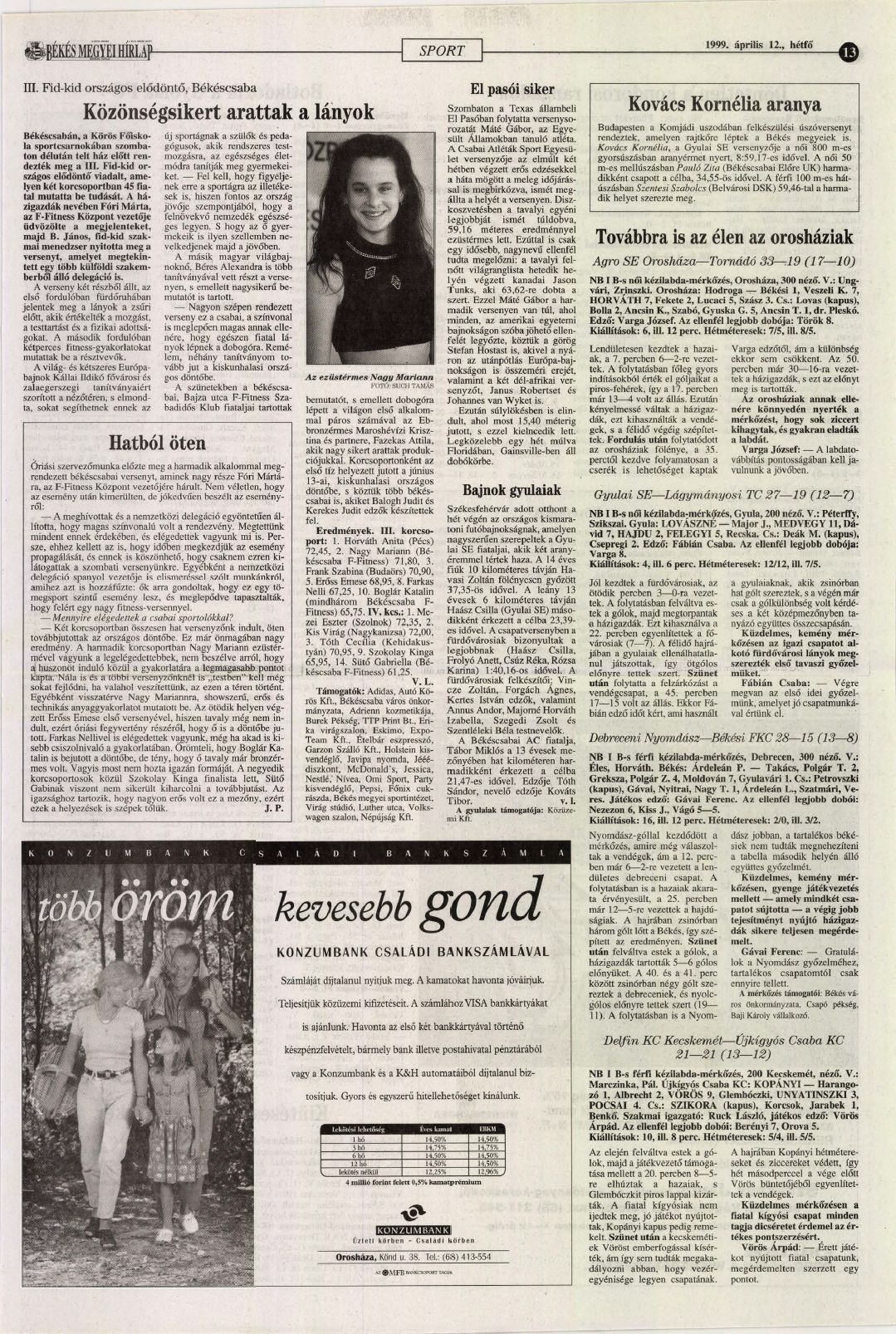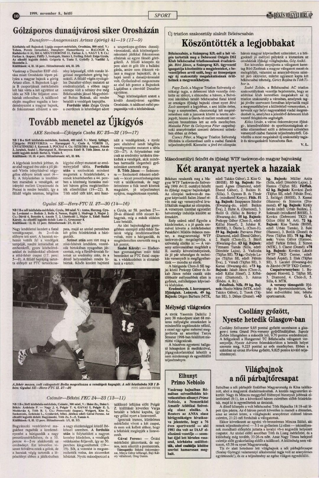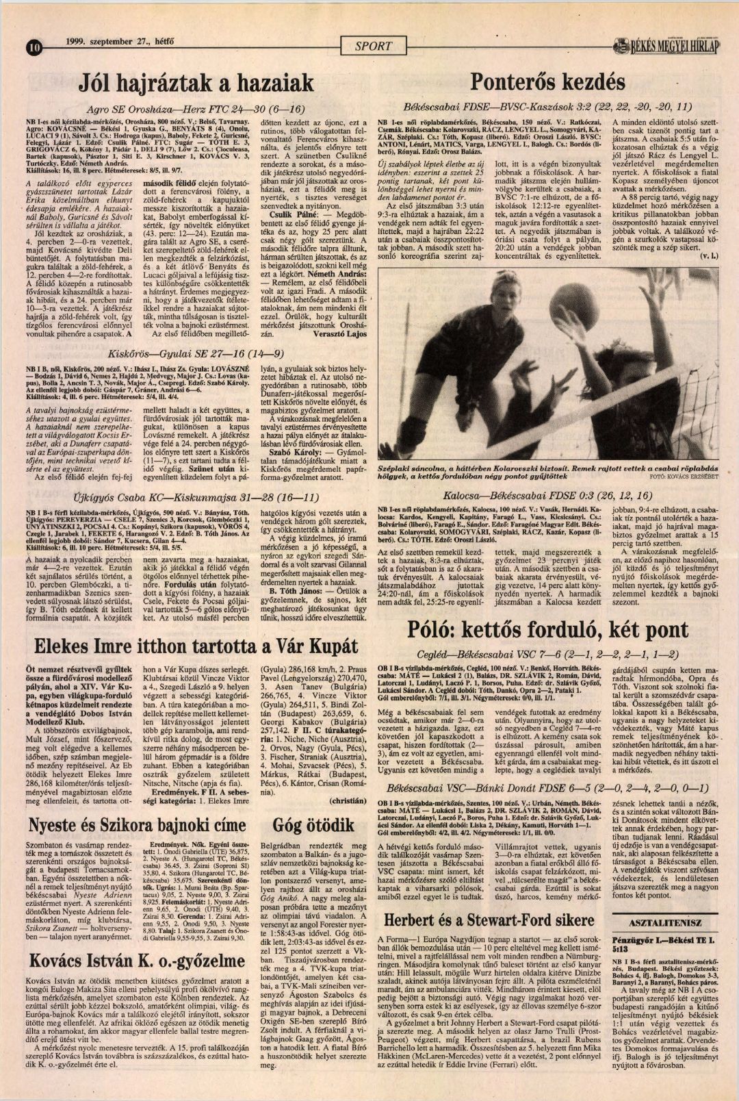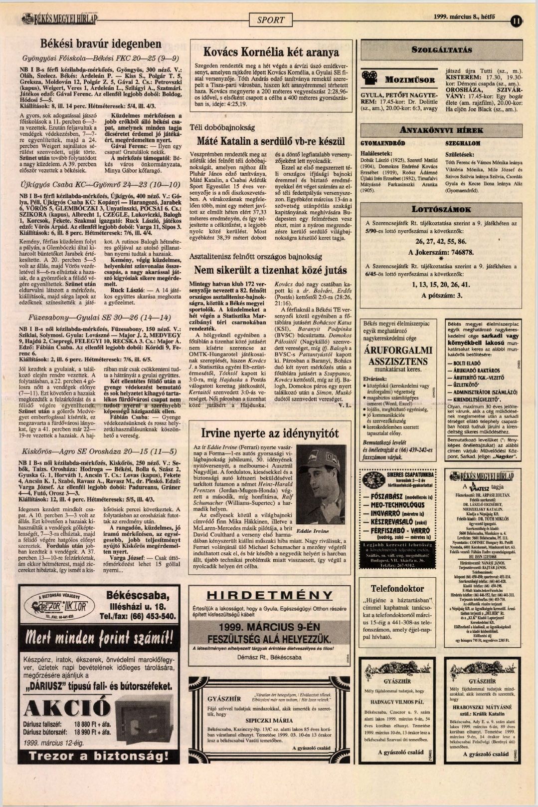 NB I B-s férfi kézilabda-mérkőzés, Békés, 900 (!) néző. V.: Belső, Tavarnay. Békés: Árdeleán P. — Nagy J. 5, Polgár T. 2, Polgár Z. 5, Gávai 3, Moldován 14, Gyulavári 2. Cs.: Petrovszki (kapus), Tóth B. 2, Szekerczés, Szatmári 1, Mike, Kiss S., Árdeleán L. Játékos-edző: Gávai Ferenc. Újkígyós: Pereverzia — Harangozó V. 1, Csele 5, Vörös 5, Szabó Sz., Unyatinszki 5, Korcsok 2. Cs.: Szikora, Kopányi (kapusok), Harangozó B. 2, Fekete 3, Czegle 2, Jarabek, Hovanyecz. Edző: B. Tóth János. Kiállítások: 14, ill. 12 perc. Hétméteresek: 10/10, ill. 2/2.
