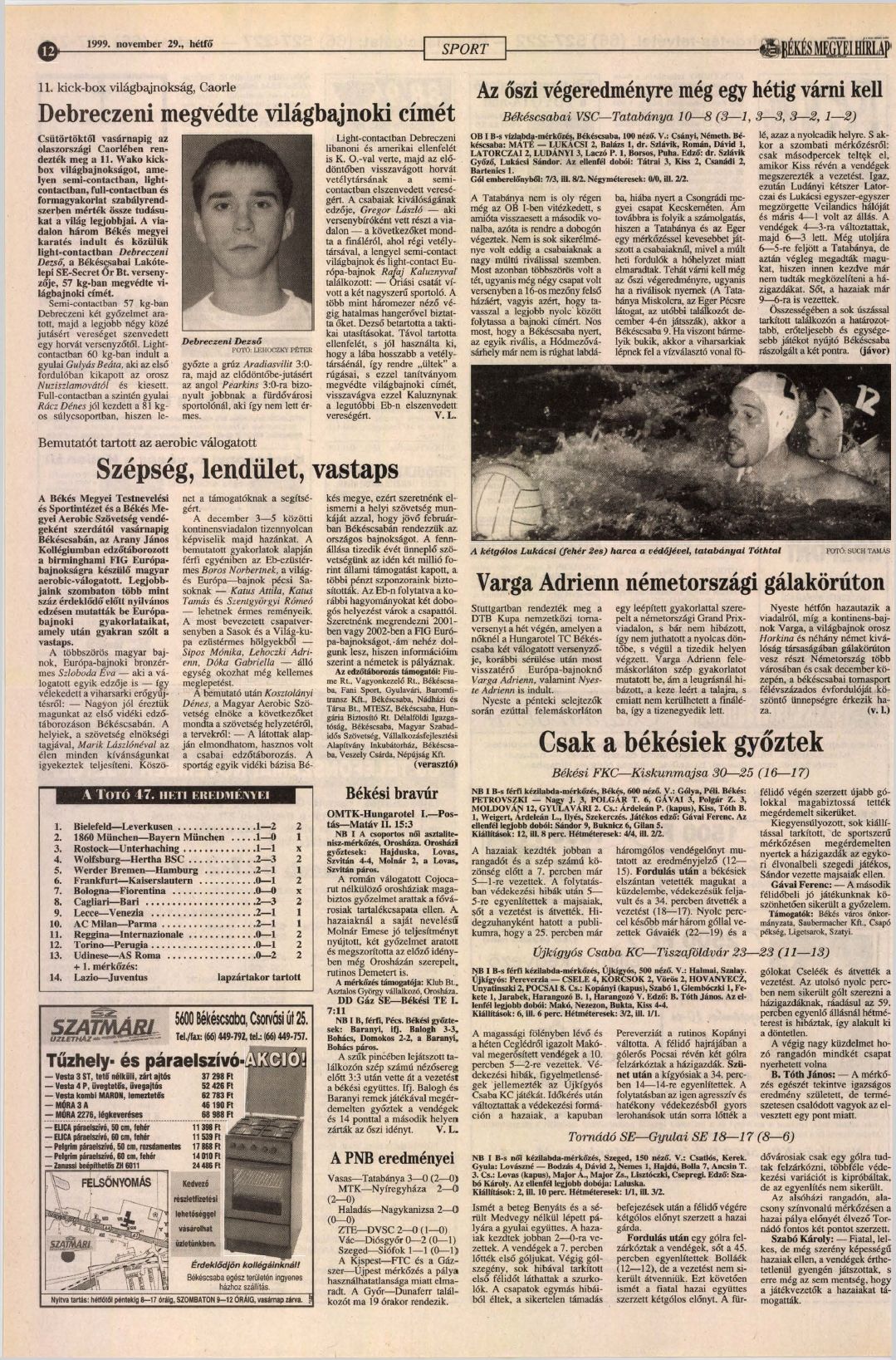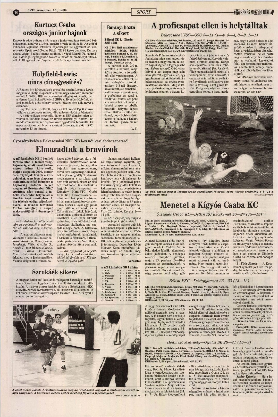 NB I B-s férfi kézilabda-mérkőzés, Újkígyós, 300 néző. V.: Dzsipoff, Szalay. Újkígyós Csaba KC: SZIKORA — Albrecht 2, Benkő 2, Czegle, Korcsok 2, UNYATINSZKI 5, Harangozó V. 1. Cs.: Kopányi (kapus), GLEMBÓCZKI 7, Jarabek 3, VÖRÖS 2. Szakmai igazgató: Ruck László, játékos-edző: Vörös Árpád. Kiállítások: 6, ill. 12 perc. Hétméteresek: 9/5, ill. 3/3.